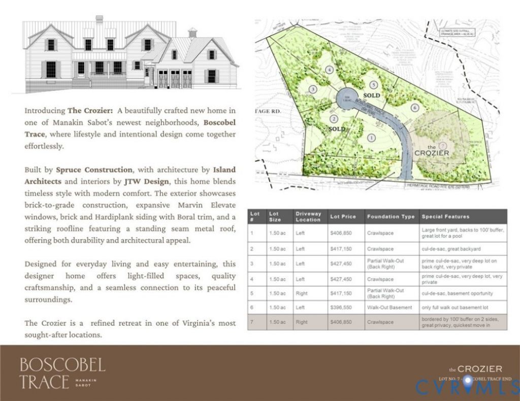 Welcome Home to Boscobel Trace - an Exceptional Custom Home Community by Spruce Construction nestled in a peaceful, yet highly sought-after location in Manakin Sabot. This community redefines upscale rural living & offers an unparalleled opportunity to build your dream home in one of the area's most desired locations. With only 7 expansive homesites, this community is thoughtfully planned to provide privacy in a natural setting. Lot 7 features The Crozier plan, designed exclusively for Spruce Construction by nationally renowned Island Architects. The Crozier spans over 5515 sf & features 5 beds, 4.5 baths, a first floor primary, 3 car garage, and open concept living with a focus on exceptional outdoor living space. Upon entering you will be greeted with stunning 10ft ceilings leading to the great room & kitchen/dining area, designed w/ effortless entertaining in mind. An oversized pantry & mud room are the perfect touches to ensure every day living is seamless & organized. A 1st floor primary showcases the ultimate oasis w/ dual vanities, stand alone tub, steam shower & huge walk-in closet. Upstairs you will find a spacious entertaining area & 4 generously sized bedrooms w/ 3 full baths. Boscobel Trace is brought to life by Spruce Construction, a locally trusted name known for exceptional craftsmanship, thoughtful design, and uncompromising quality. Each home will be a unique reflection of its owner's vision, tailored through Spruce's custom homebuilding process-from concept to completion. Conveniently located minutes from Route 288 & Interstate 64, you can quickly access the area's finest dining, shopping, & entertainment in Short Pump & beyond. Or, you can stay closer to home to enjoy Goochland County's wealth of outdoor activities, from a round of golf/tennis at Hermitage Country Club or Kinloch, or in the riding ring at the area's most prestigious equestrian facilities like Deep Run Hunt Club. At Boscobel Trace, whether you prefer to stay home or go out, you're never far from the best the region has to offer!